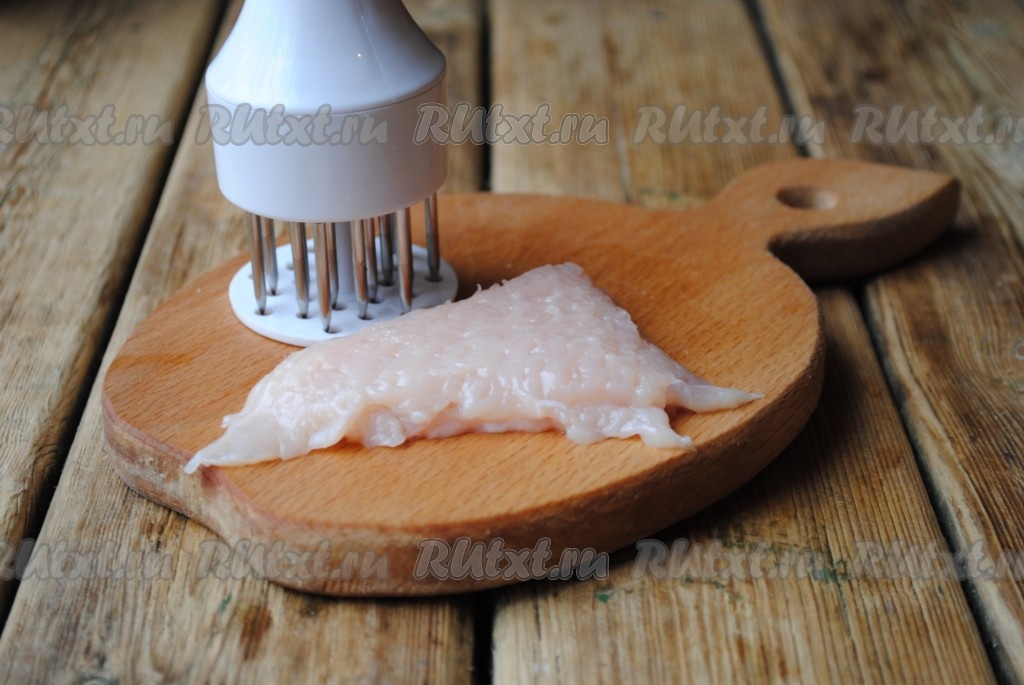 Каждый кусочек мяса отбить с помощью молоточка для отбивных или же воспользоваться специальным приспособлением для отбивания мяса - тендерайзером (нужно просто нажать на кусок мяса и металлические лезвия тендерайзера пробьют мясо насквозь, за счёт таких проколов мясо хорошо замаринуется и будет сочным).
