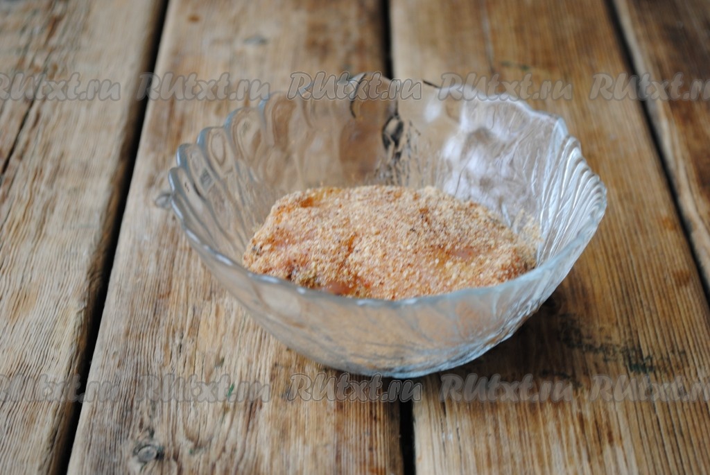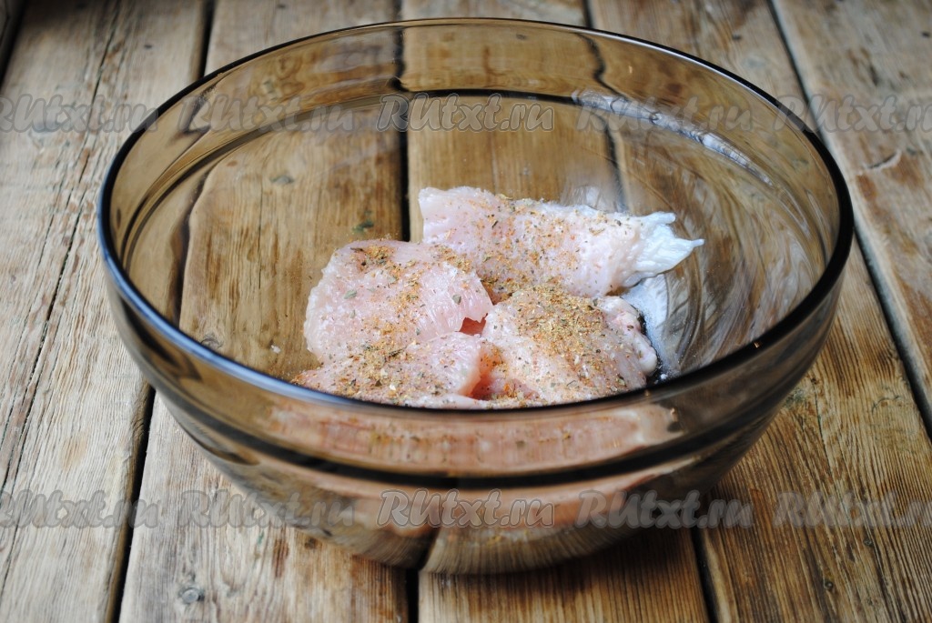 Всыпать к куриному филе приправу и оставить мариноваться при комнатной температуре минут на 10-15.