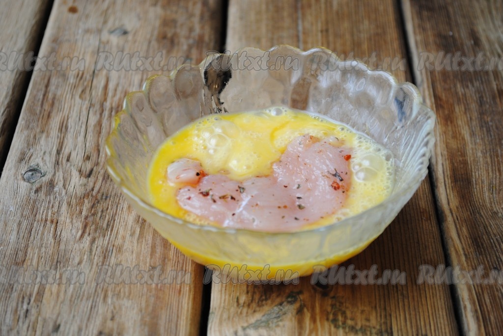 Яйцо вбить в миску, добавить щепотку соли и хорошо размешать с помощью вилки. В отдельную миску всыпать панировочные сухари. Каждый кусок мяса обмакнуть в яйцо.