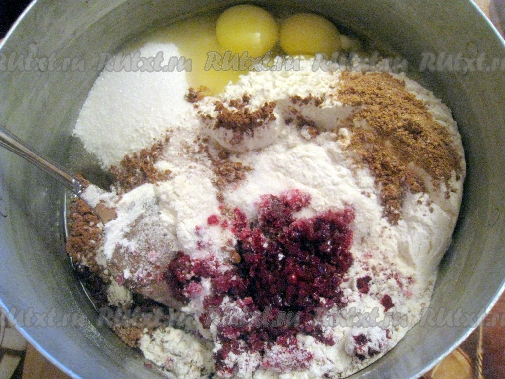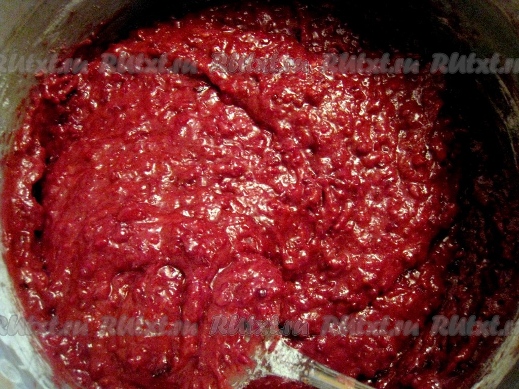 После тщательного перемешивания получится густое, но пышное тесто свекольного цвета.
