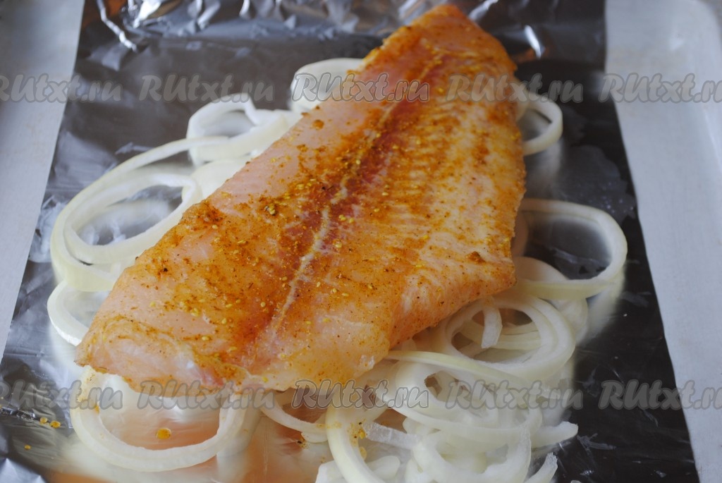 Если филе пангасиуса замороженное, его надо разморозить, обмыть и обсушить. Натереть филе солью, приправой к рыбе со всех сторон и выложить на луковую подушку.