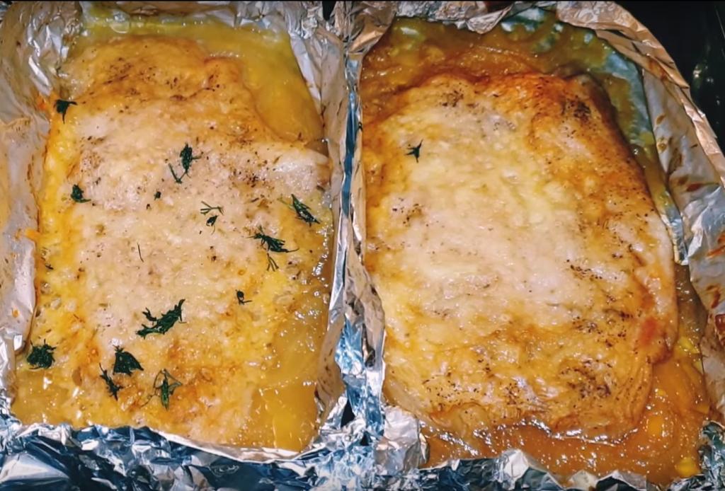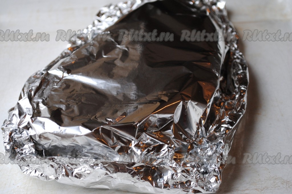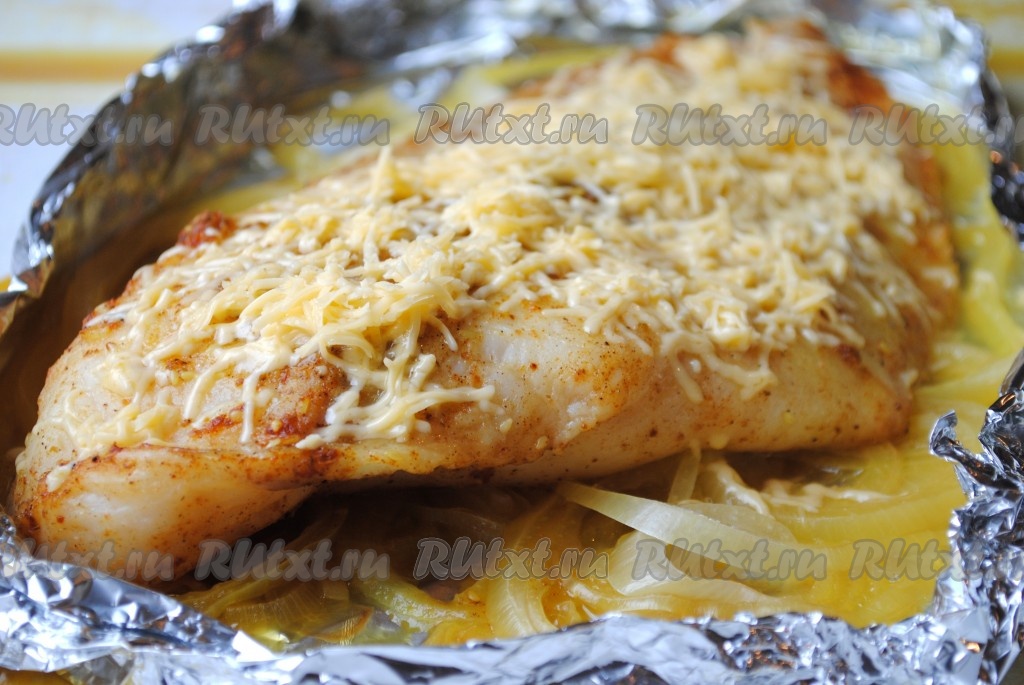 Затем фольгу развернуть, рыбу притрусить натёртым твёрдым сыром и отправить ещё на 10 минут в духовку (до образования аппетитной сырной корочки).