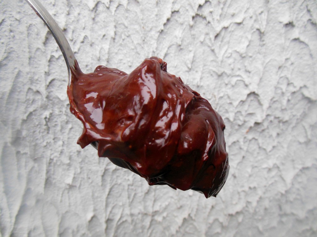 Шоколадная паста из какао готова, ее можно кушать сразу или дать немного застыть в холодильнике. В холодильнике паста отлично застывает. На фото видно, как хорошо она держит форму.
