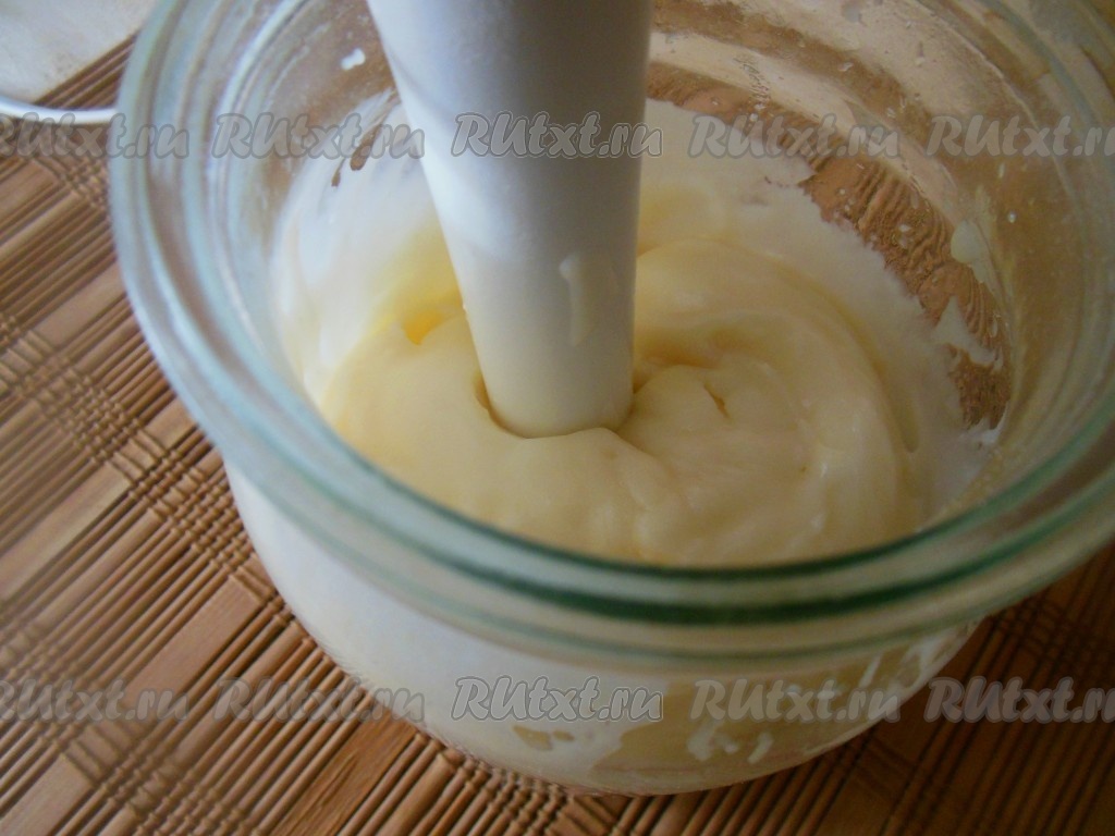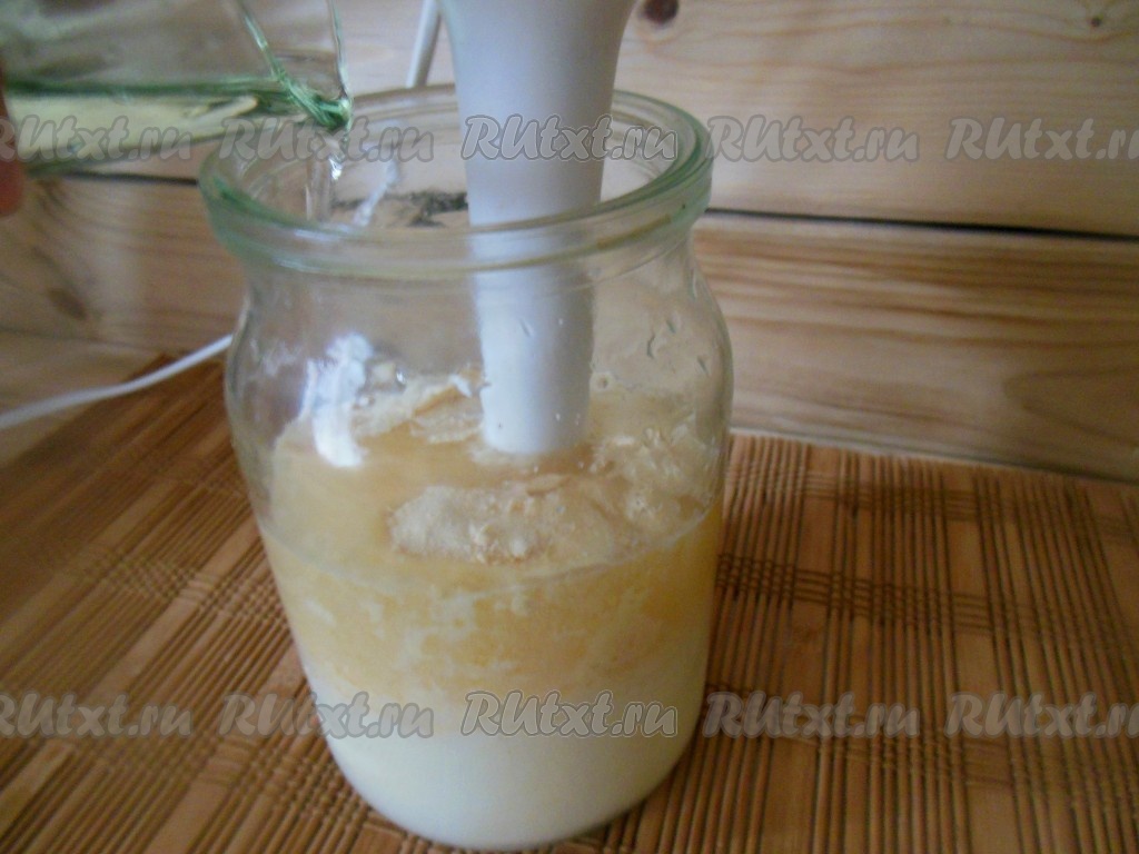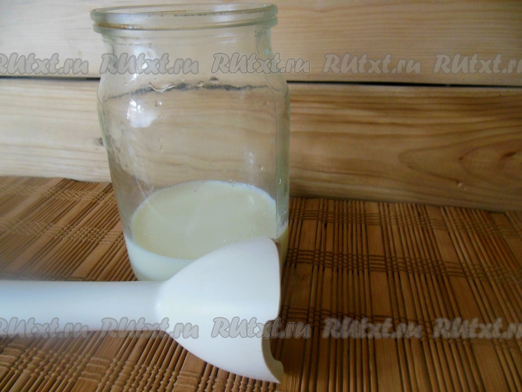 Взбейте молоко с сахаром при помощи погружного блендера. Затем добавьте в банку сухое молоко, взбейте блендером до получения однородной массы. Продолжая взбивать, введите тонкой струйкой растительное масло. В процессе взбивания, масса постепенно загустеет (на это потребуется 1-2 минуты).