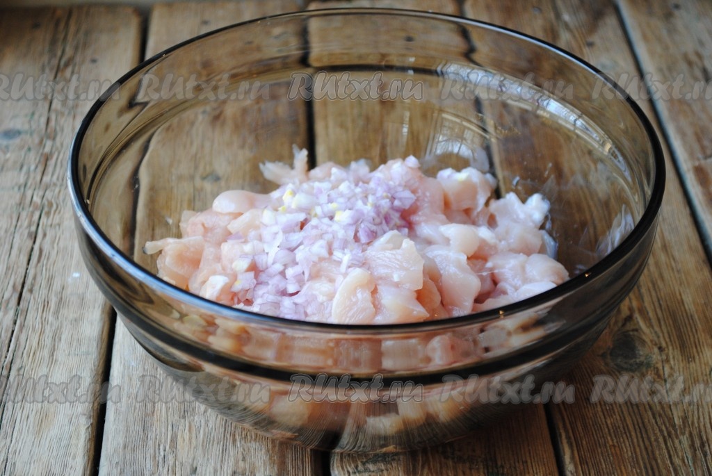 Очищенный лук, мелко нарезав, добавить к филе.