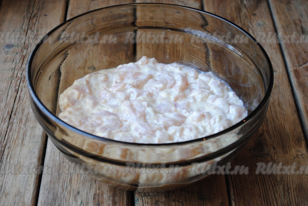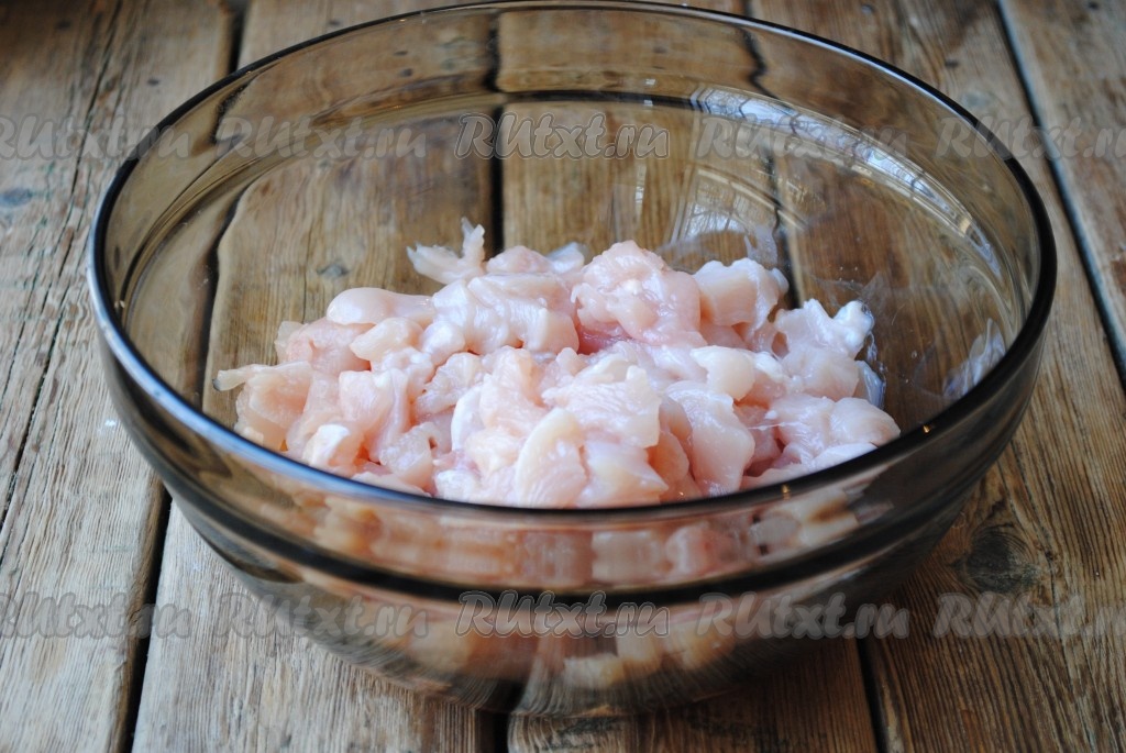 Куриное филе вымыть, обсушить и нарезать мелкими кубиками. Выложить нарезанное мясо в миску, добавить соль (сильно солить не нужно, так как в дальнейшем будет добавляться майонез, а он - достаточно солёный), чёрный молотый перец и перемешать.