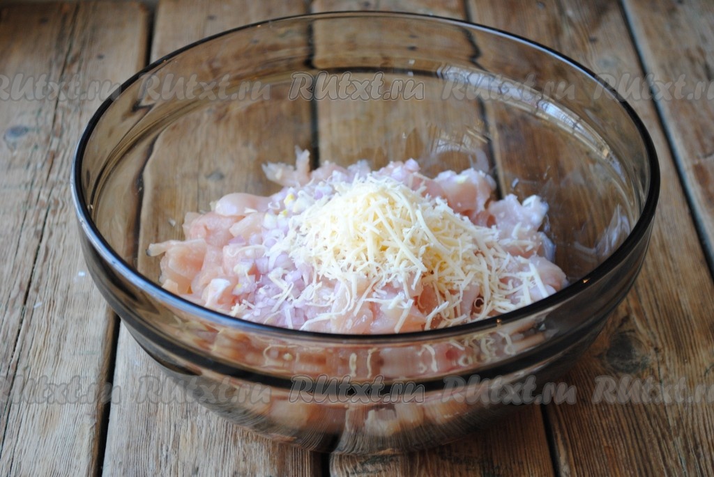 Сыр, натерев на средней тёрке, выложить к луку и куриному мясу.