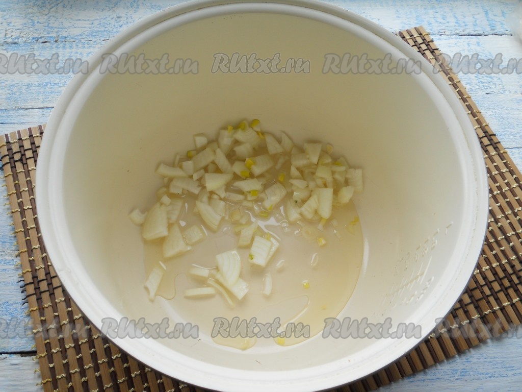 Растительное масло налить в чашу мультиварки, добавить нарезанный небольшими кусочками репчатый лук, выставить программу "Жарка" на 10 минут и, помешивая, обжарить лук до сигнала.