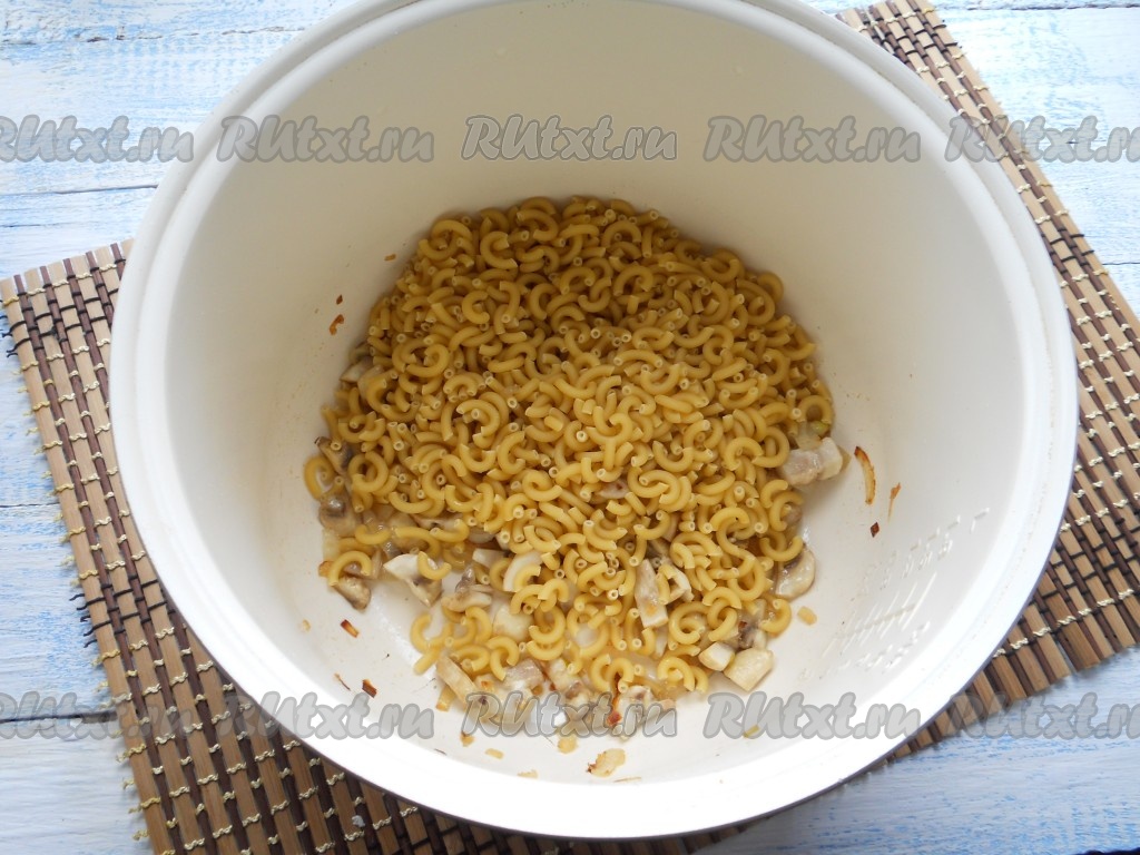 Шампиньоны нарезать на 4-6 частей, добавить их к луку и снова выставить программу "Жарка" на 10 минут. Обжаривать грибы с луком отведенное время, периодически помешивая. Всыпать сухие макароны в чашу мультиварки к грибам и луку.