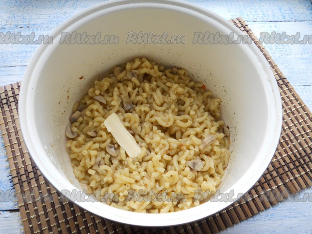 Далее выставить программу мультиварки "Тушение" на 25 минут, крышку закрыть. В готовые макароны с грибами добавить сливочное масло.