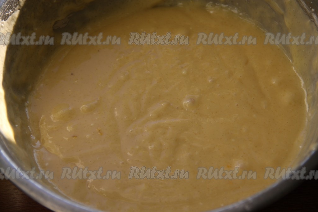 В получившуюся массу добавить растительное (или растопленное негорячее сливочное) масло, разрыхлитель, перемешать до однородности. Частями начать добавлять муку, тщательно перемешивая тесто. Добавляя муку, ориентируйтесь на консистенцию теста для маффинов. Тесто должно получиться однородным, похожим по консистенции на густую сметану.