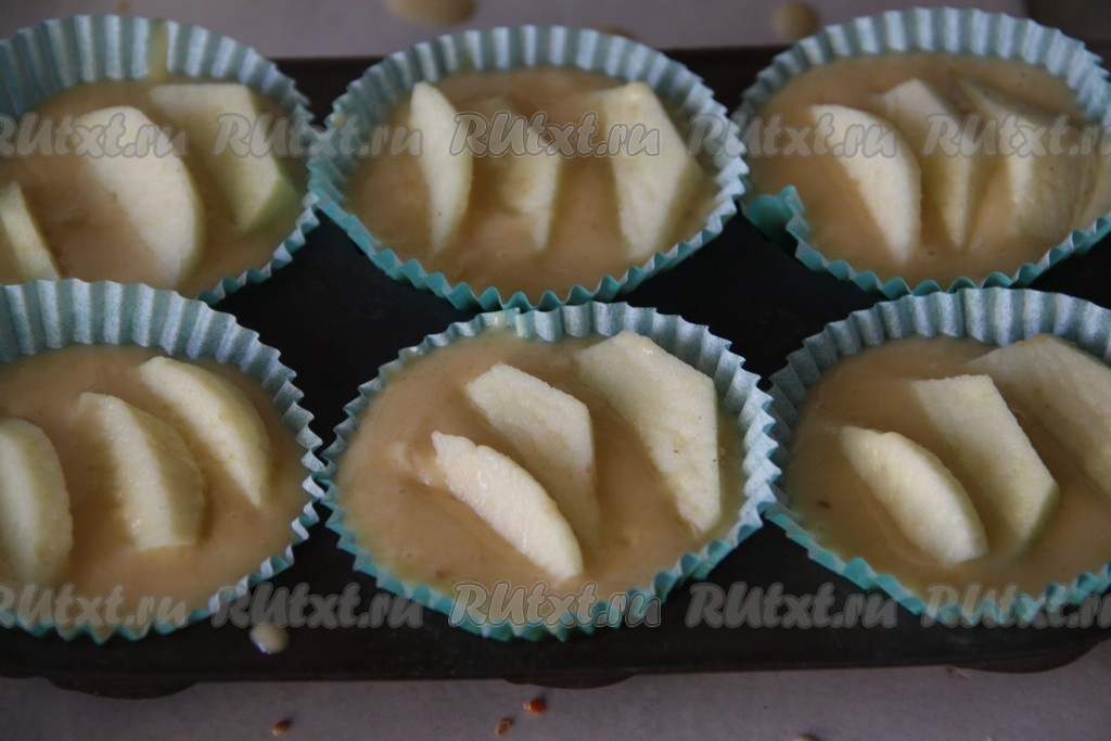 В формы для кексов (силиконовые формочки можно не смазывать маслом) налить тесто, заполняя формы на 2/3. Дольки яблок выложить на тесто, слегка окуная их в него.