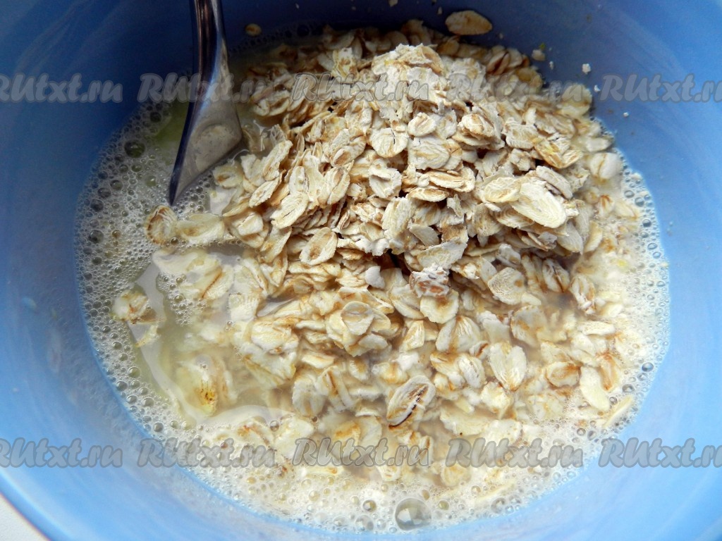 Яйцо разбить, добавить воду и взболтать вилкой. В получившуюся смесь добавить овсяные хлопья, размешать и оставить на 25-30 мин.