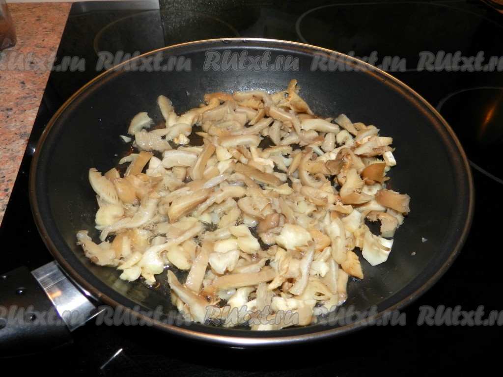В сковороде разогреть масло, обжарить сначала вешенки, затем добавить лук.