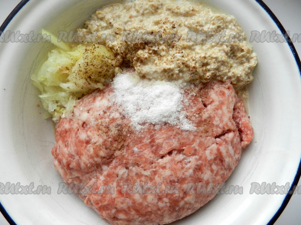 В мясной фарш добавить натертую на терке половинку луковицы, смесь овсянки с яйцом, соль и черный молотый перец.