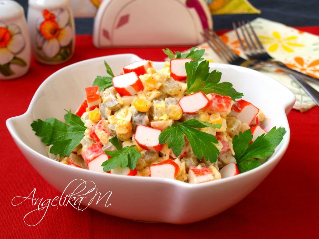 Простой, незатейливый и вкусный салат можно приготовить с крабовыми палочками и маринованными огурцами. Такой салатик подойдёт в качестве дополнения к различным гарнирам на завтрак или ужин. Салат готовится довольно быстро, для него нужно только сварить заранее яйца, остальные ингредиенты уже готовы к употреблению.
