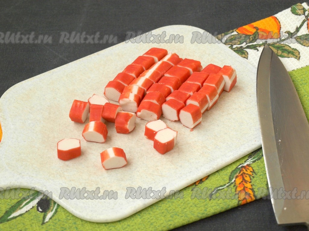 Крабовые палочки нарезать достаточно крупно (по желанию, пару штук оставить для украшения).
