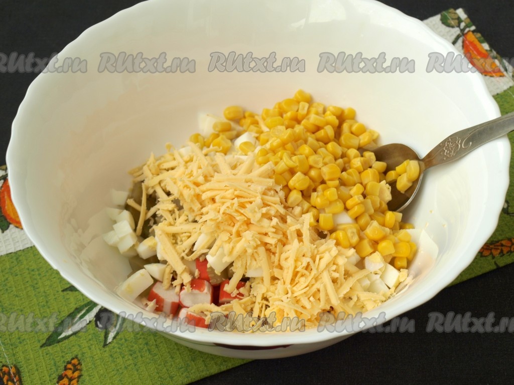 Твёрдый сыр натереть на крупной тёрке и вместе с консервированной кукурузой добавить в салат к яйцам, маринованным огурцам и крабовым палочкам.