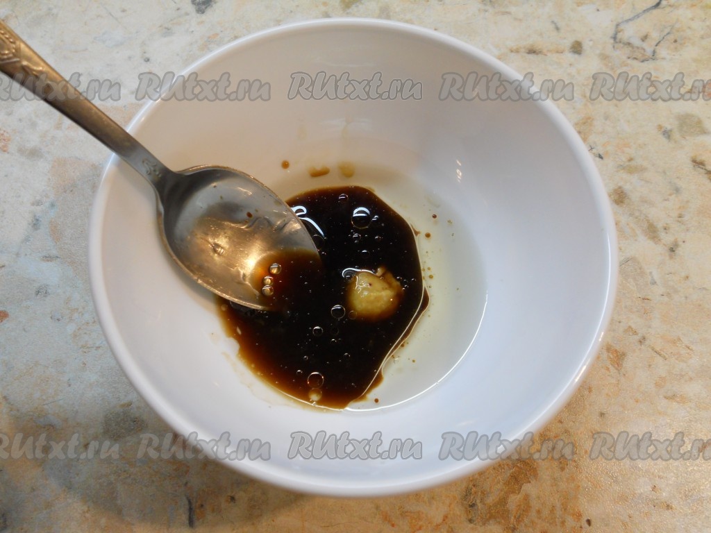Приготовить заправку: к соевому соусу добавить бальзамический уксус, оливковое масло, горчицу, сахар и апельсиновый сок, тщательно перемешать до однородности.