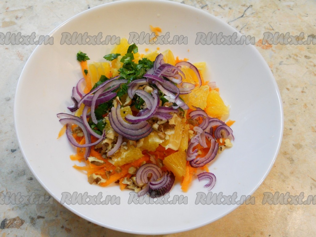 В салат из моркови и апельсина добавить мелко нарезанную петрушку и порубленные грецкие орехи.