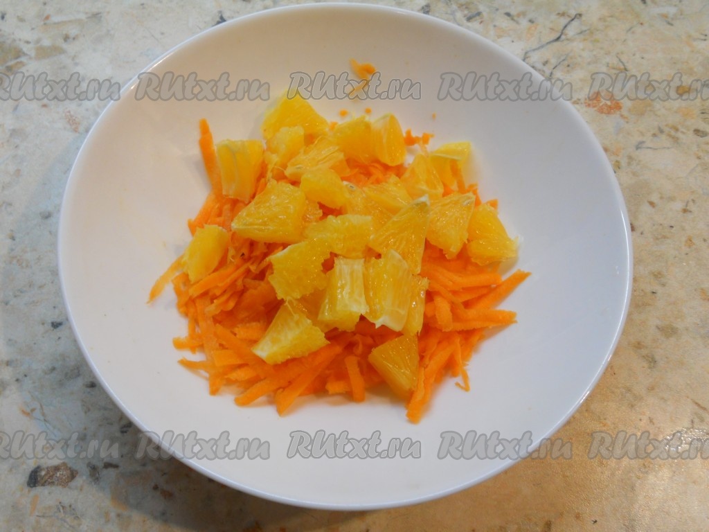 Морковь очистить и натереть на крупной терке. Апельсин очистить и, удалив пленочки, нарезать кусочками. Выложить апельсин к моркови.