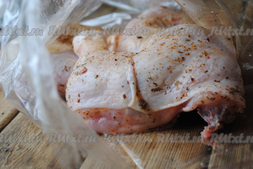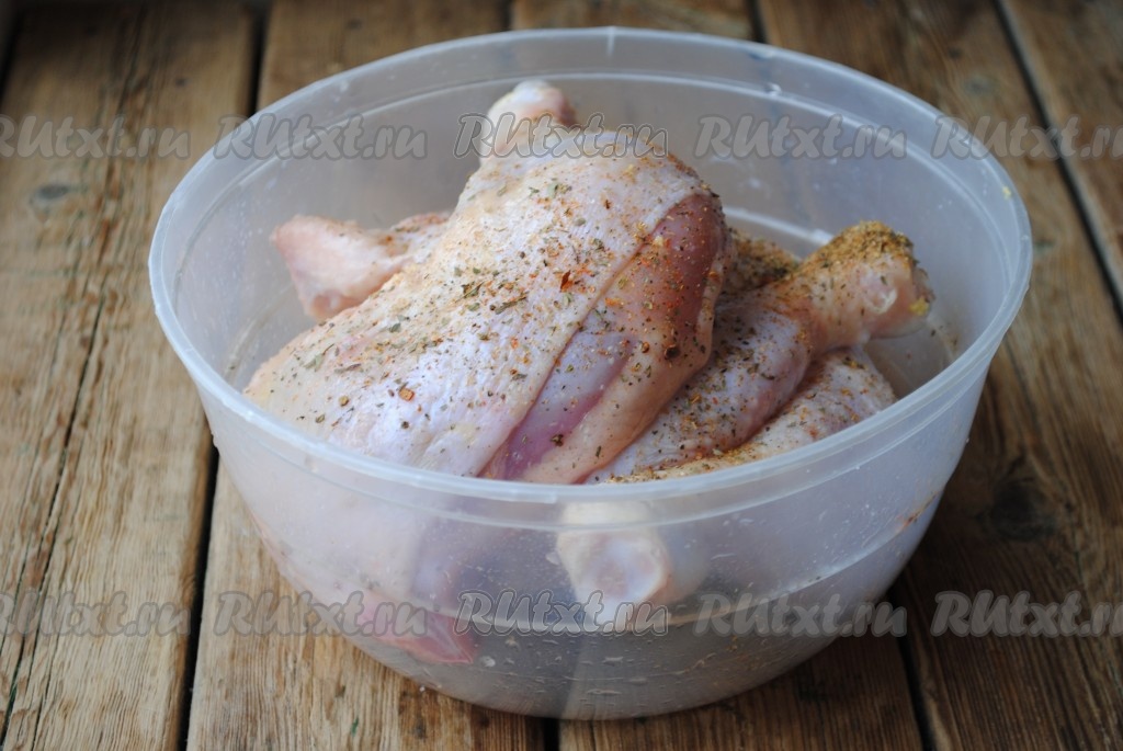 Каждый окорочок хорошо натереть солью и приправой к курице, оставить минут на 30 при комнатной температуре.
