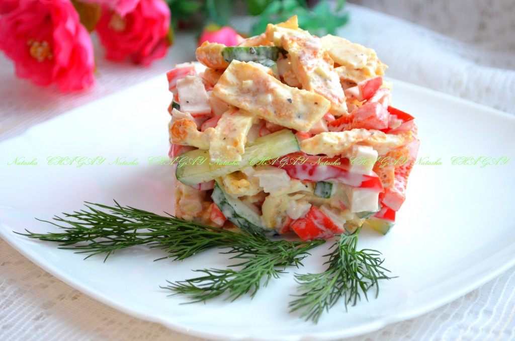 К праздничному столу решила приготовить яркий, вкусный салат с яичными блинчиками и крабовыми палочками. Салатик получился сытным, пикантным, он понравился всей семье. Сочетание крабовых палочек с яичными блинчиками - очень удачное, особенно если их дополнить свежими и сочными овощами. Готовится салатик достаточно просто. Уверена, этот аппетитный салат многим придётся по вкусу!