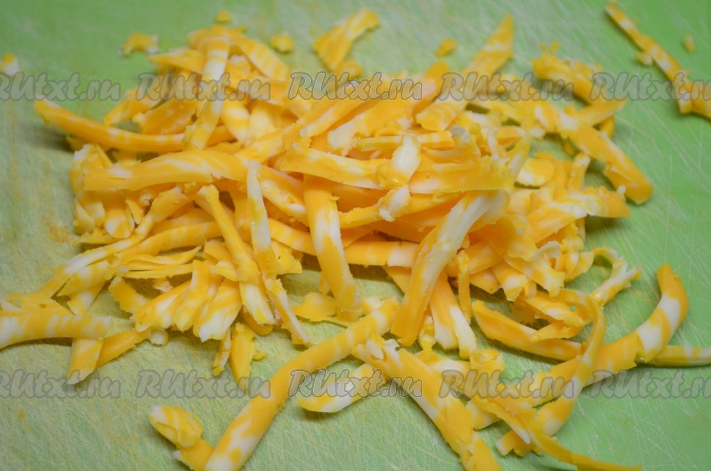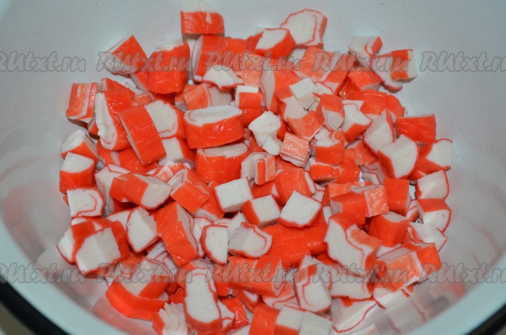 Крабовые палочки заранее разморозить. Снять с них слюду и нарезать на кусочки.