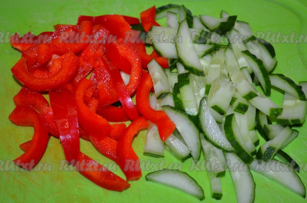 Болгарский перец очистить от плодоножки с семенами. Вымыть болгарский перец и огурец, затем нарезать на небольшие кусочки.