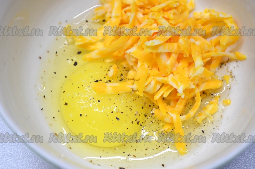 В миску разбить 1 яйцо, добавить половину натёртого сыра, посолить и поперчить по вкусу, взбить вилкой.