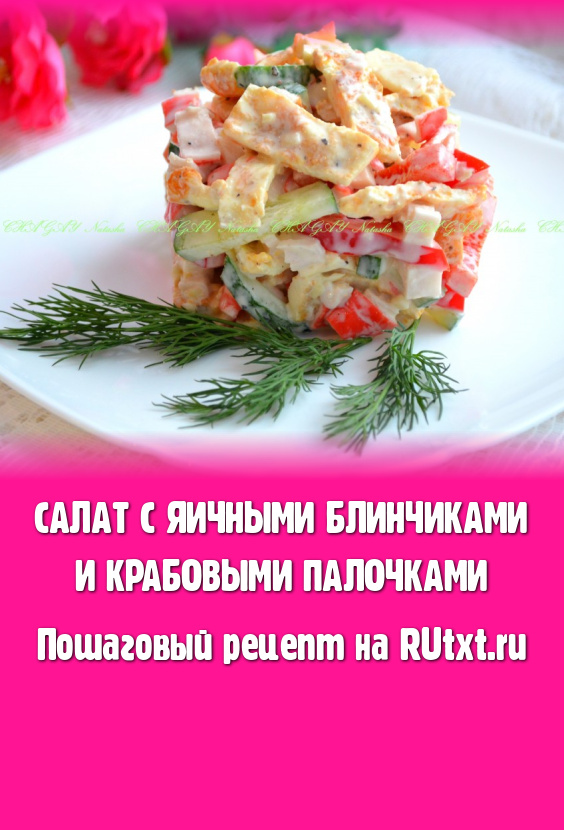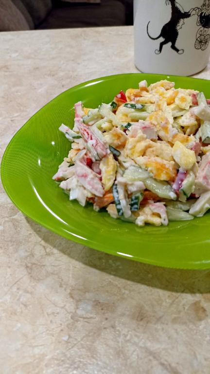Аккуратно перемешать и выложить в салатник. Салат с яичными блинчиками и крабовыми палочками готов. Вкусно, просто и сытно, пробуйте!