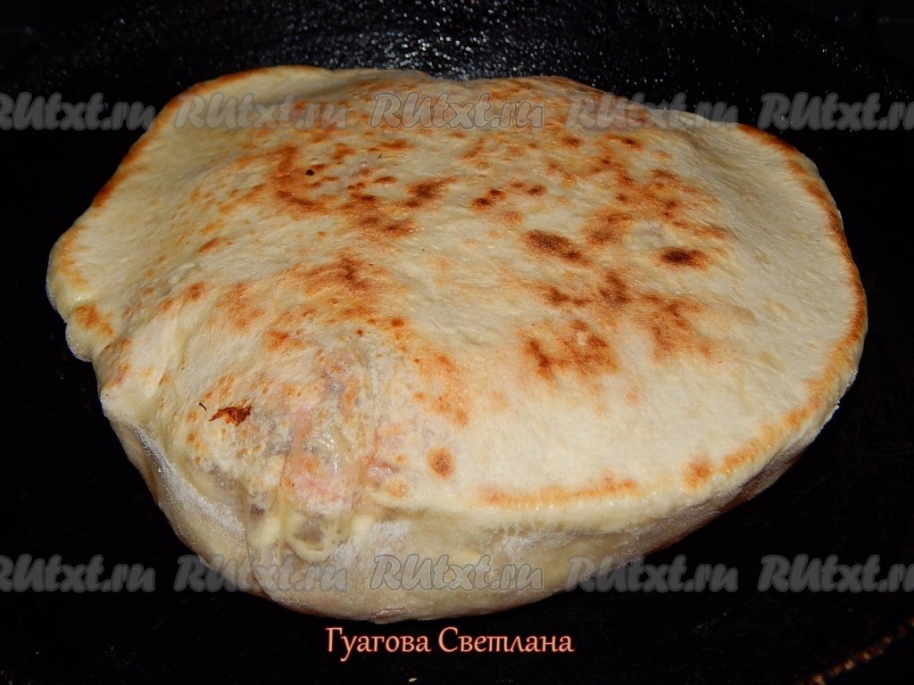 Каждый "мешочек" медленно и аккуратно, чтобы тесто не порвалось, раскатать с помощью скалки. Должны получиться 5 тонких лепешек (толщиной около 1/2 сантиметра) с капустой внутри. Жарить лепешки на разогретой сковороде без масла на среднем огне с двух сторон (примерно по 2-3 минуты с каждой стороны), накрыв сковороду крышкой.