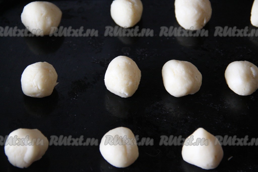 Через час достать тесто и разделить его на 30 одинаковых шариков. Каждый шарик выложить на противень, смазанный маслом или застеленный бумагой для выпечки.