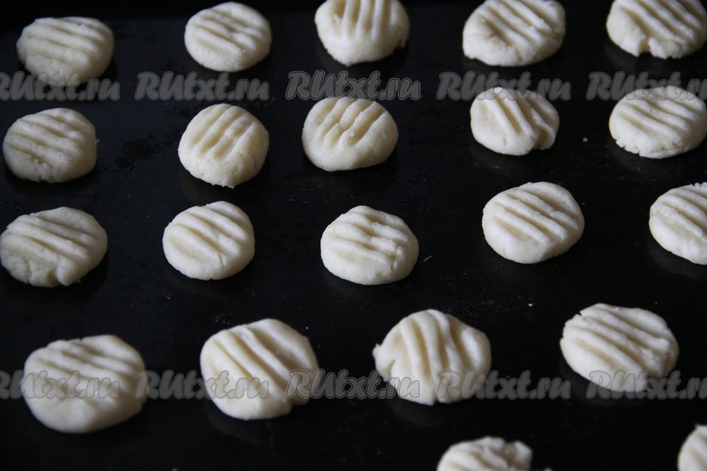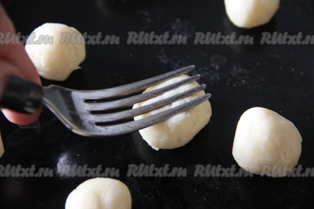 Прижать вилкой каждый шарик из теста.