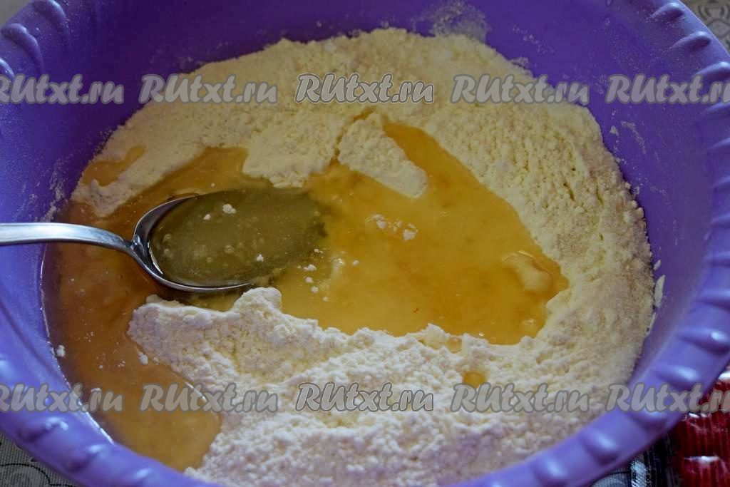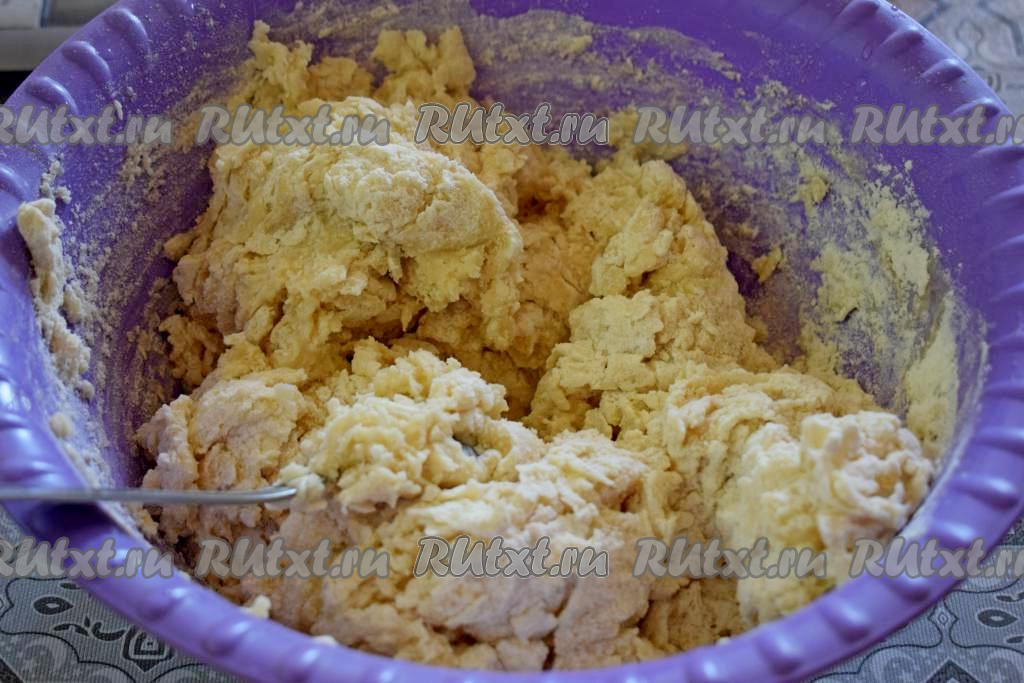 Когда тесто уже будет сложно перемешивать ложкой, продолжить замешивать его руками, добавляя по мере необходимости понемногу оставшуюся муку и тщательно вмешивая её.