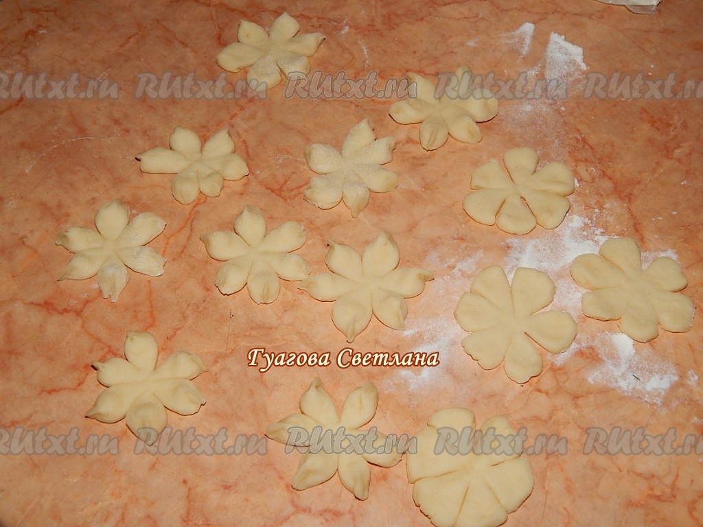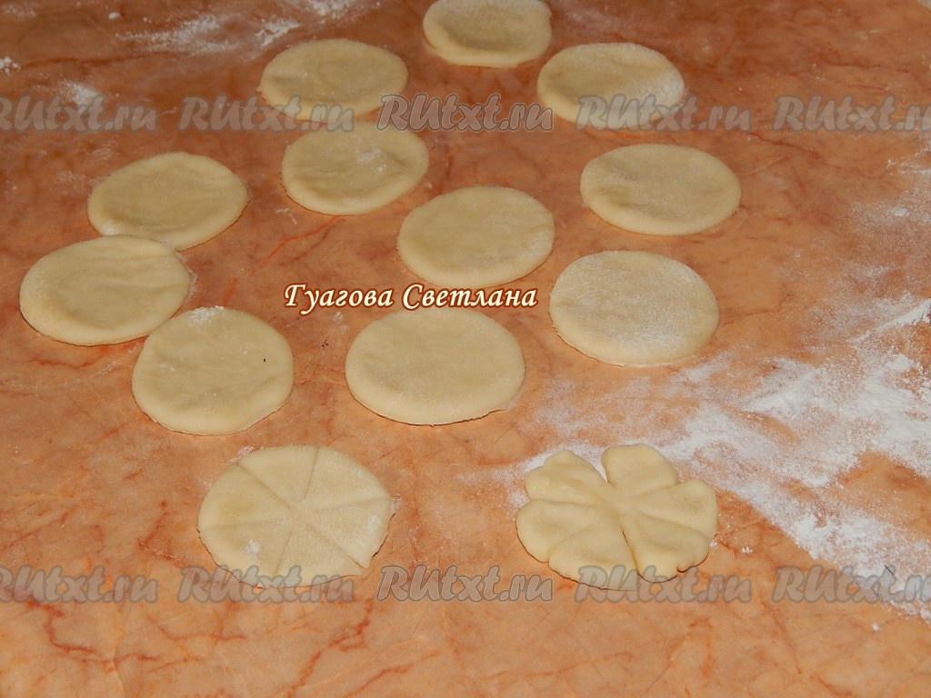 Для приготовления украшения в виде цветка, нужно отложенное тесто достаточно тонко раскатать и рюмкой вырезать кружки одинакового размера.