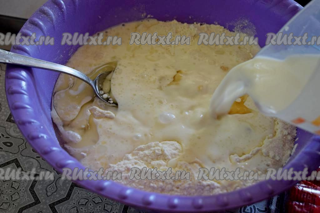 Молоко подогреть до тёплого состояния. Вливать молоко небольшими порциями в тесто, перемешивая тесто столовой ложкой.