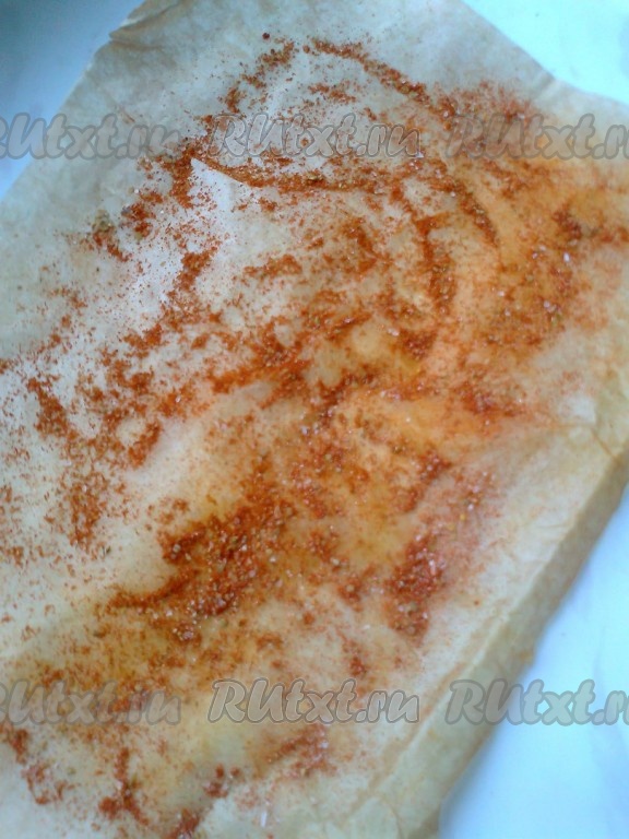 Подготавливаем пергамент, отрезаем нужный кусок пергамента (бумаги для выпечки), в который потом завернем творог, посыпаем пергамент солью и смесью специй паприки и пажитника