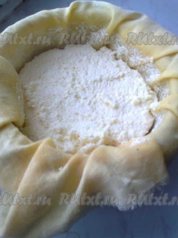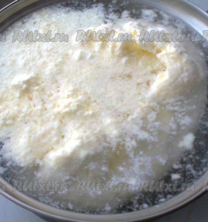 Творог должен разморозиться. Дуршлаг застилаем полотном или марлей, сложенной в несколько слоев, ставим его в подходящую посуду (кастрюлю) и выливаем в него творог с водой. Даем стечь воде в течение 15-20 минут. Воду, которая стекла, можно использовать для приготовления блинов, оладий, для выпечки хлеба, то есть там, где нужно использовать кислое молоко.