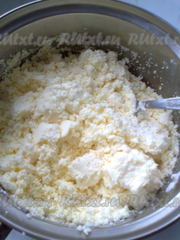 В кастрюлю из нержавейки или с толстым дном (чтобы творог не подгорел) кладем отцеженный творог, соль, соду, растительное масло (или растопленное сливочное масло, с ним мне понравилось больше), размешиваем и ставим кастрюлю с содержимым на медленный огонь.