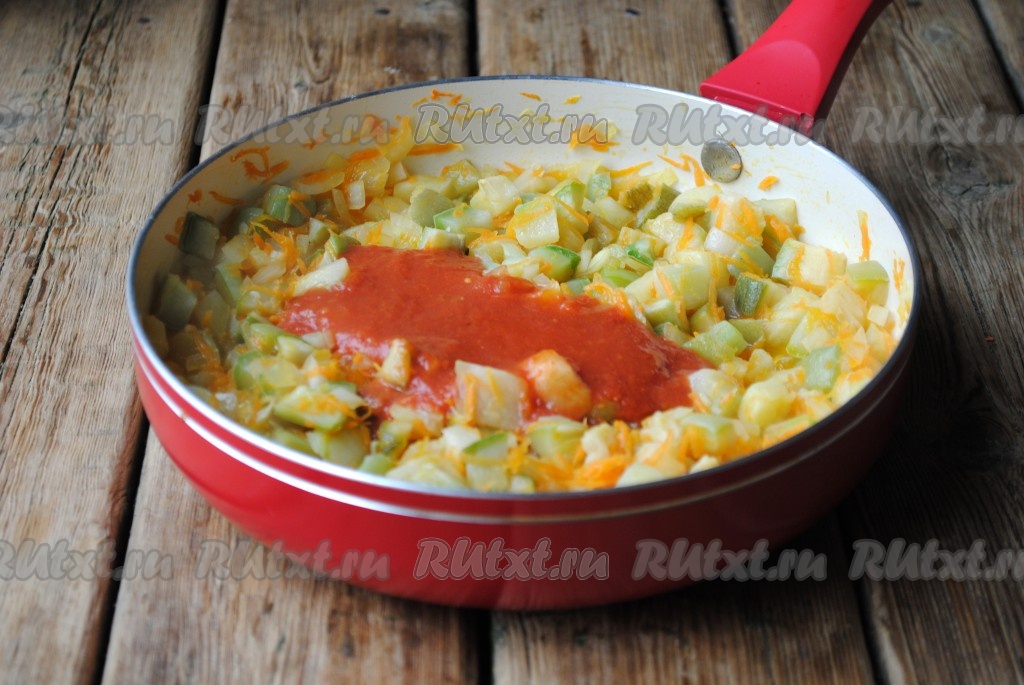 Готовить овощи на среднем огне 10-15 минут, периодически помешивая. Во время приготовления образуется много жидкости, она должна выпариться, поэтому крышкой сковороду накрывать не надо.