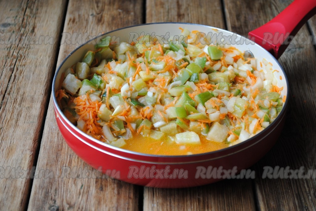 Лук и морковь очистить и вымыть. Лук нарезать кубиками, морковь натереть на средней терке. Вслед за кабачками отправьте в сковороду лук и морковь.