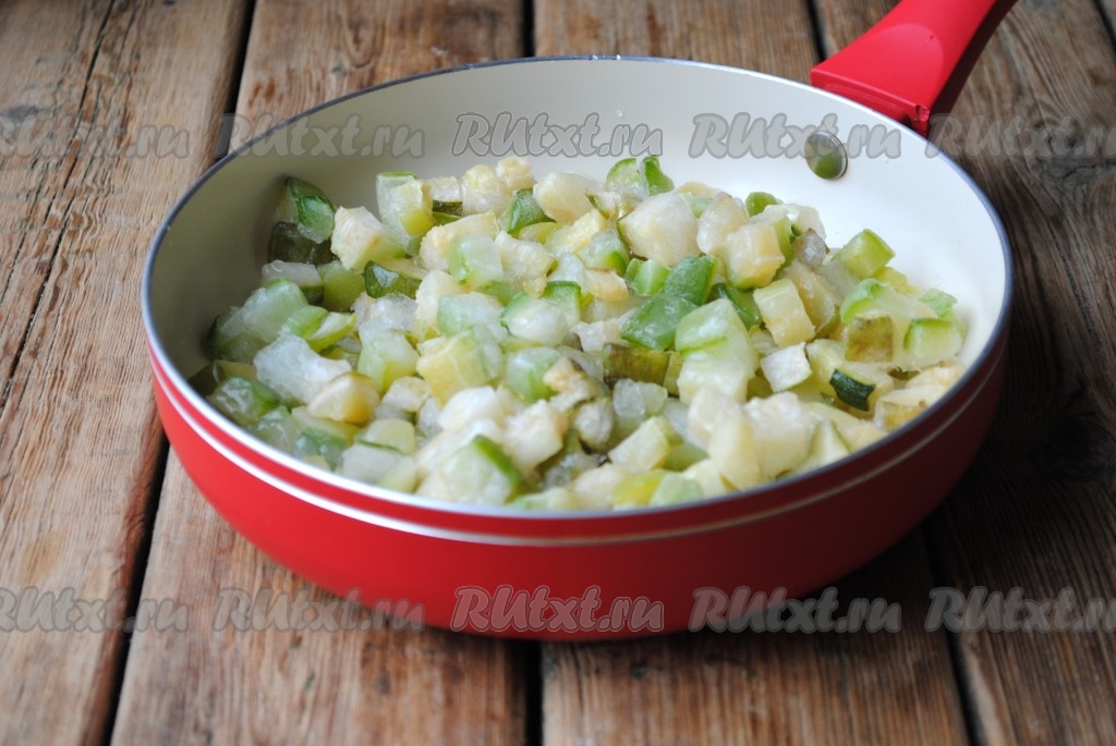 В сковороду налить небольшое количество растительного масла. Добавить замороженные кабачки, предварительно размораживать их не надо. Сковороду отправить на плиту.