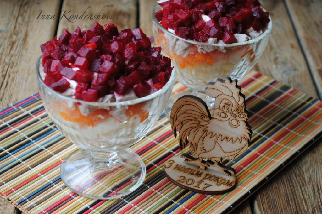 Заранее отварить свинину в подсоленной воде до готовности (время варки от 50 минут до 1,5 часов), затем остудить. Не очищенные картофель, морковь и свеклу вымыть, залить водой и отварить до готовности, затем остудить и очистить. Картофель и морковь можно варить в одной кастрюле. А вот свеклу лучше варить отдельно, чтобы она не окрасила другие овощи. Дать мясу и овощам остыть. Очищенный картофель нарезать небольшими кубиками.