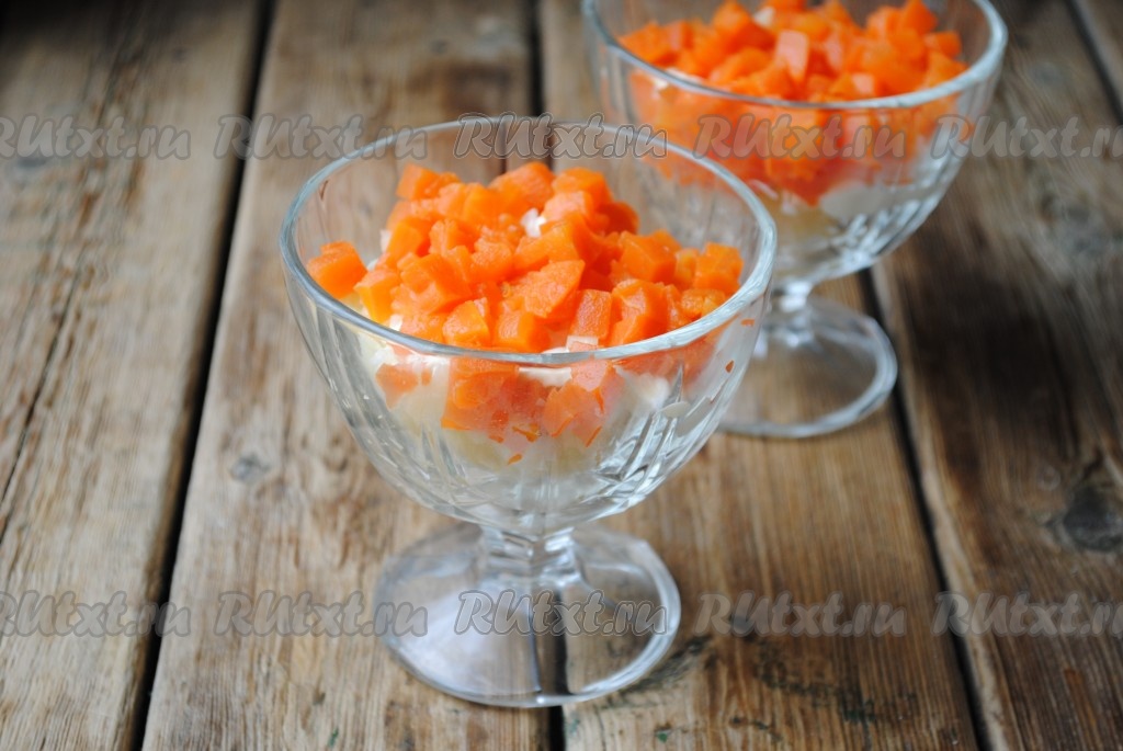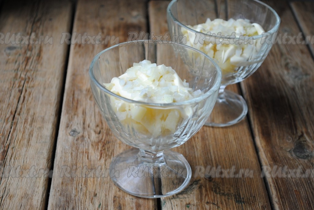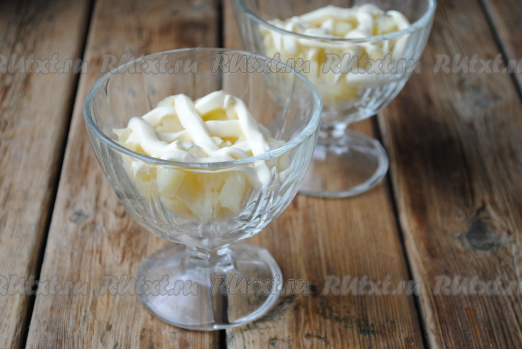 Когда все ингредиенты подготовлены, можно приступать к сборке салата. В креманку первым слоем выложить картофель, сверху сделать сеточку из майонеза.