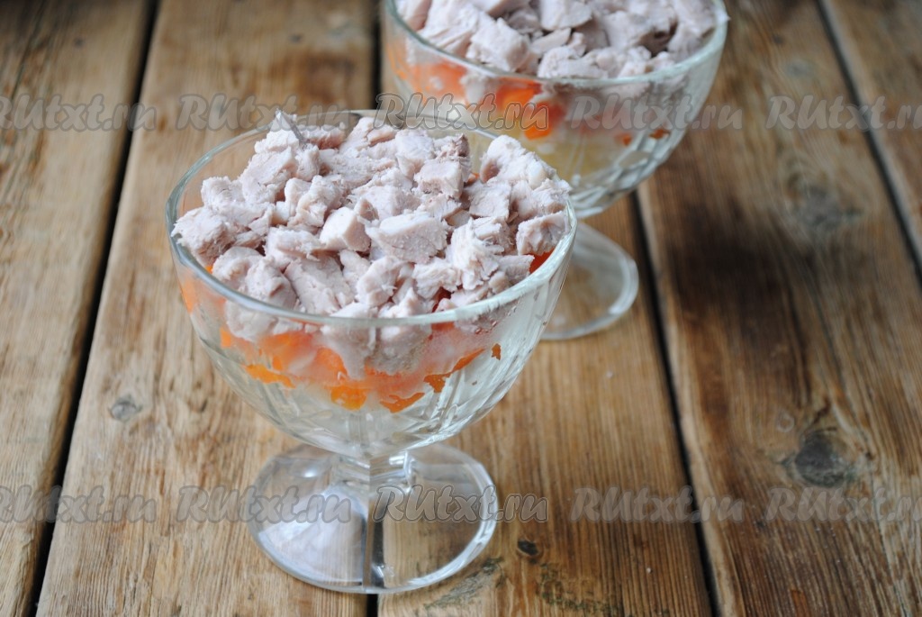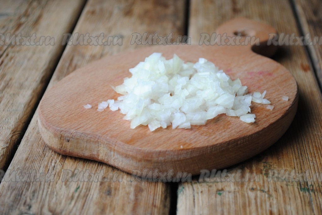 Затем выложить лук. Если нужно, слои салата можно подсаливать.