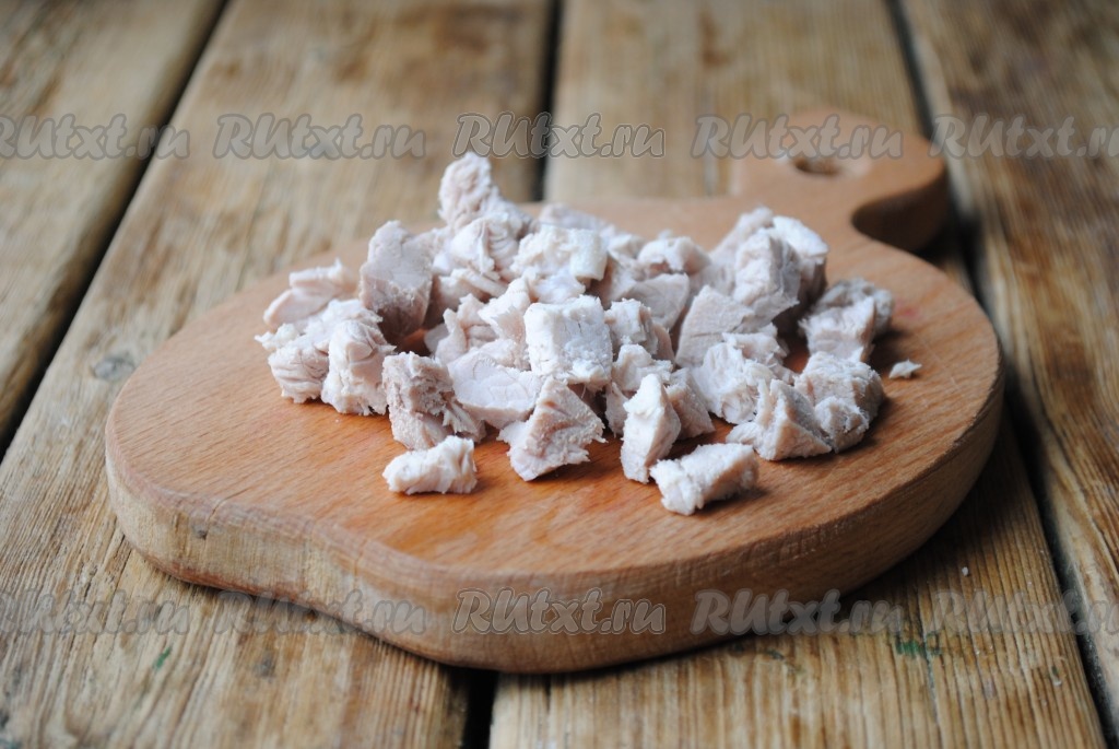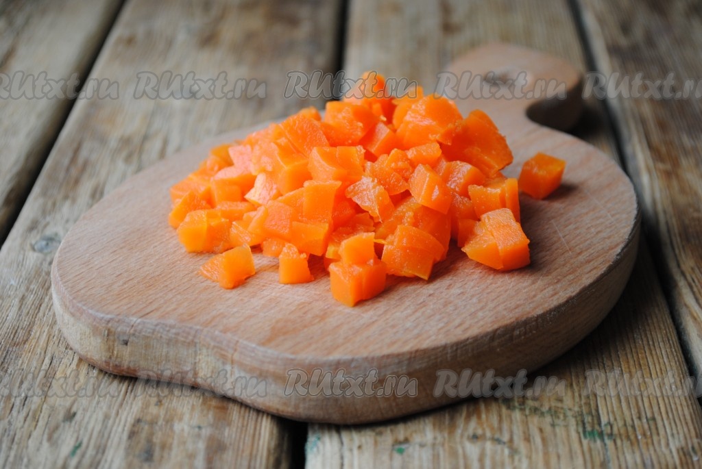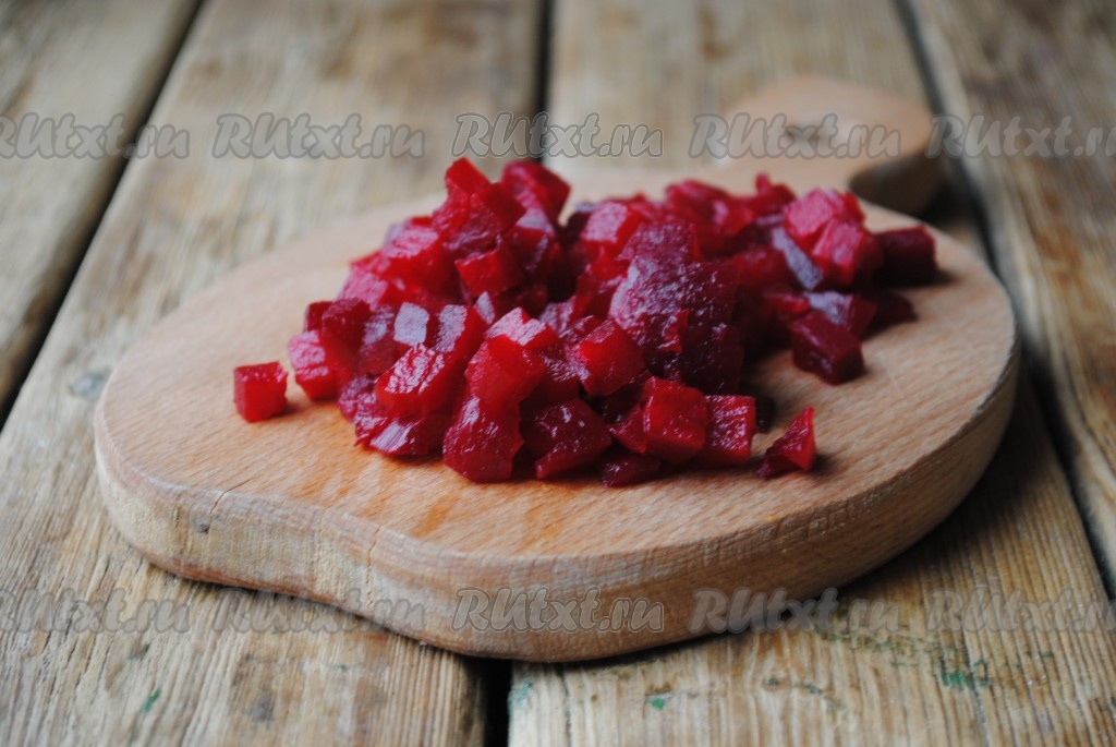 Очищенную свеклу нарезать кубиками, лучше всего это делать в перчатках, так как свекла сильно окрашивает руки.