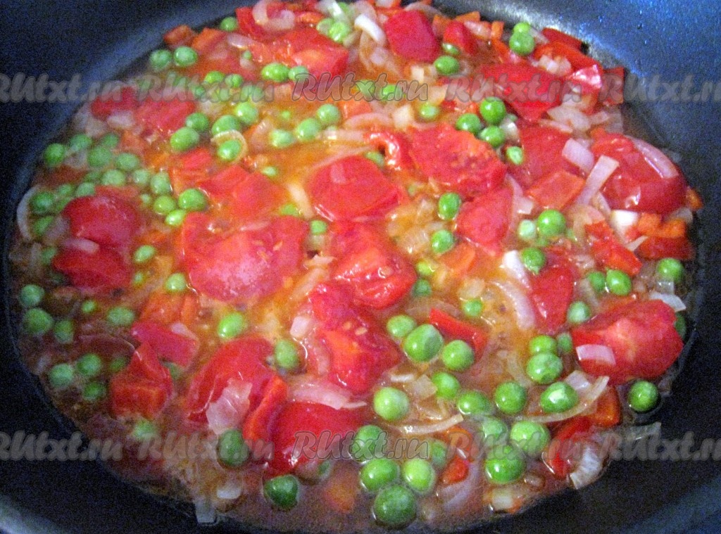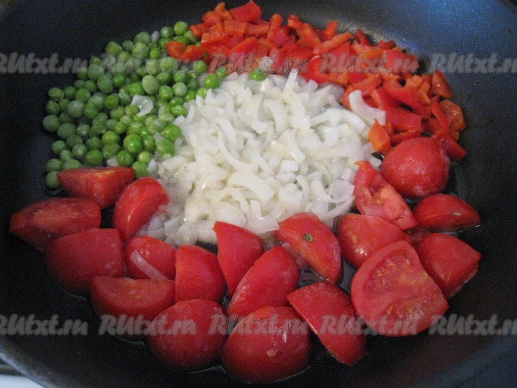 На чуть разогретую сковороду с растительным маслом положить порезанные овощи: лук, горошек, помидоры и перец и обжарить их слегка в разных частях сковороды.