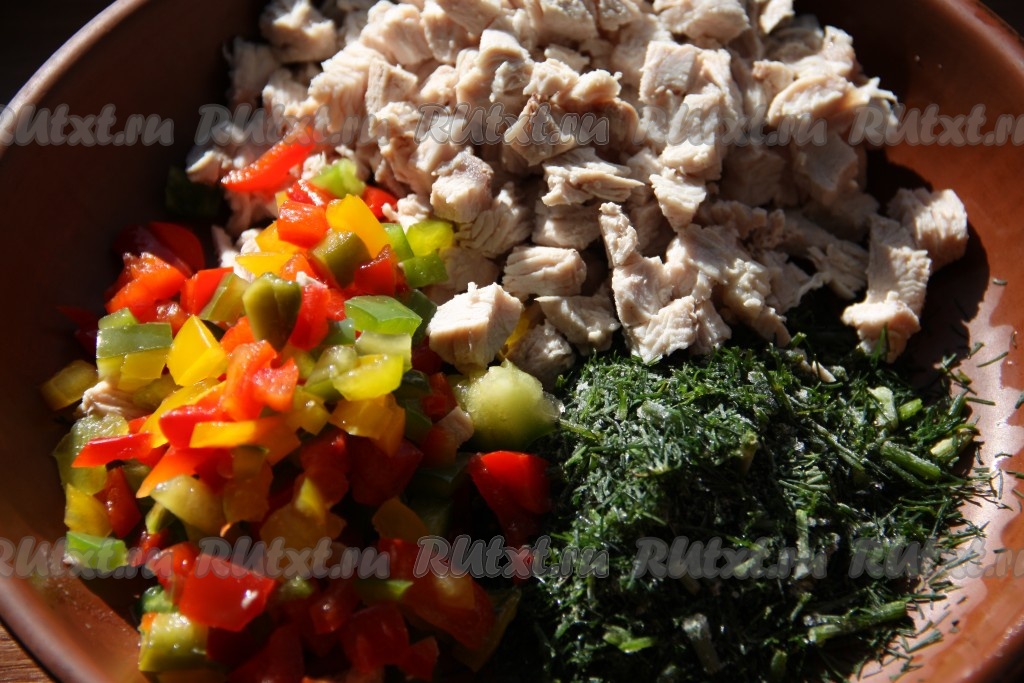 Вареное куриное мясо и болгарский перец нарезать маленькими кубиками, добавить мелко нарезанную зелень, перемешать и начинка для блинов готова.