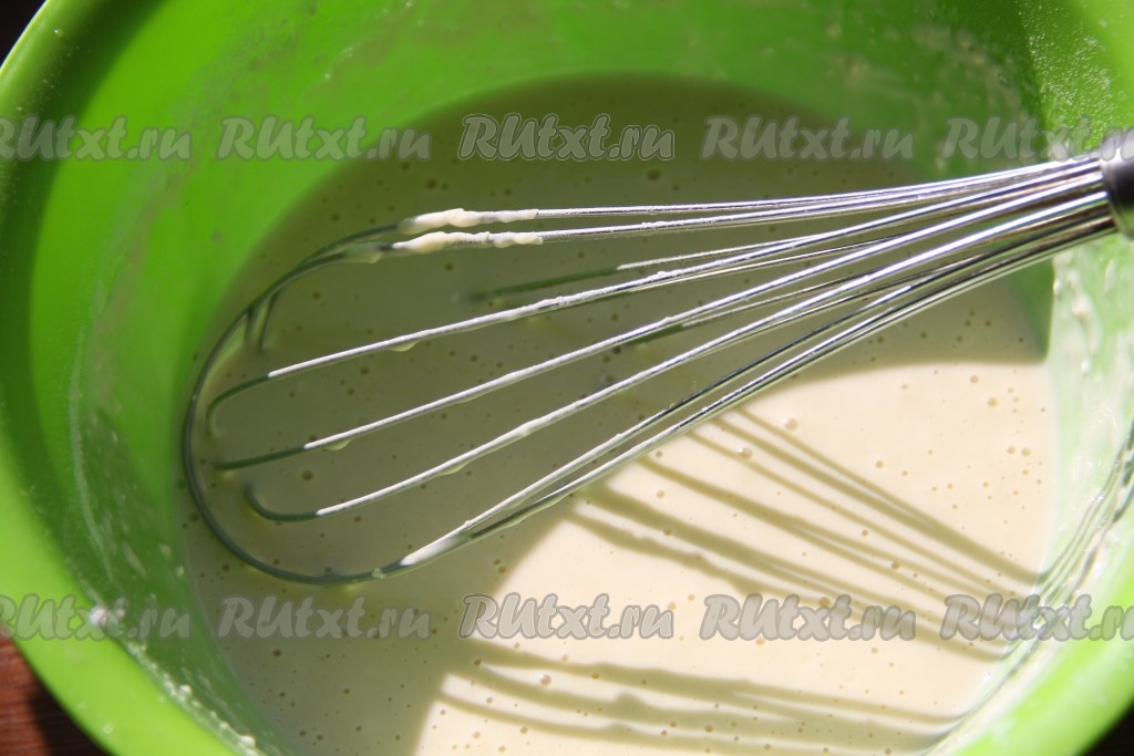 Для приготовления блинного теста взбить яйца со сметаной и растительным маслом.